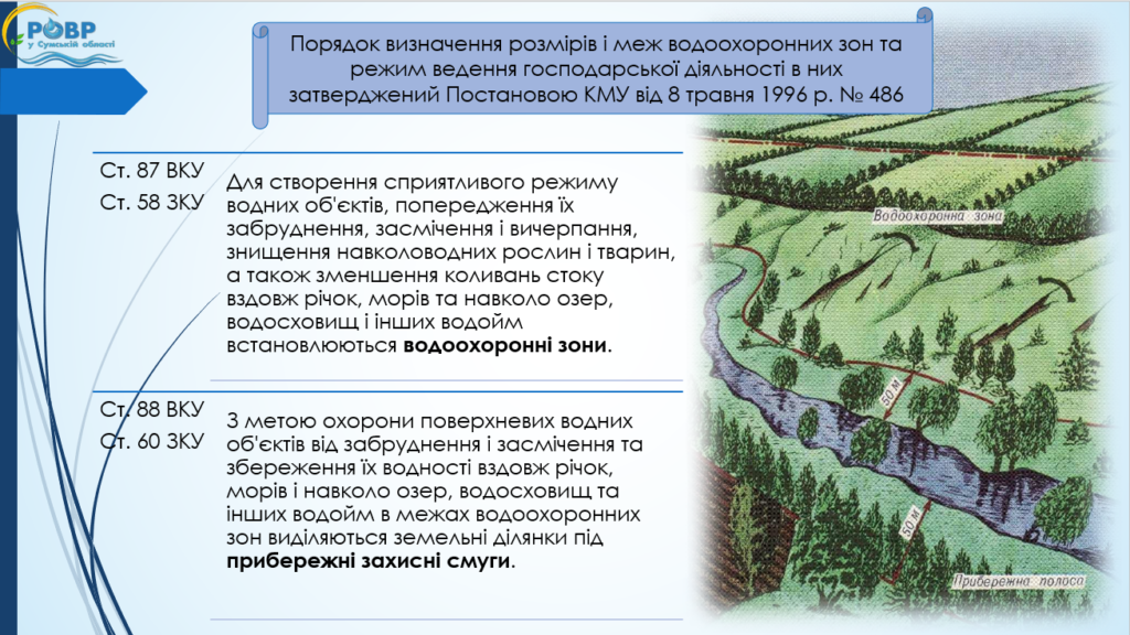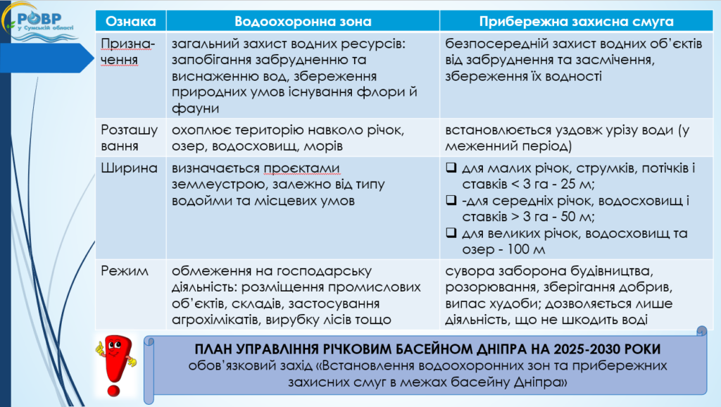 До основних заходів Плану управляння річковим басейном Дніпра на 2025-2030 роки внесений захід, обов’язковий до виконання всіма без виключення сільськими, селищними, міськими радами в межах всіх річкового басейну, – «Встановлення водоохоронних зон та прибережних захисних смуг в межах басейну Дніпра» відповідно до ст. 87, 88 ВКУ, який передбачає: