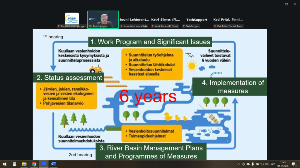 Механізми впровадження планів управління річковими басейнами (ПУРБ), програми моніторингу, органи влади та залучення зацікавлених сторін – Туро Х’єрппе, старший спеціаліст, Міністерство навколишнього середовища Фінляндії;