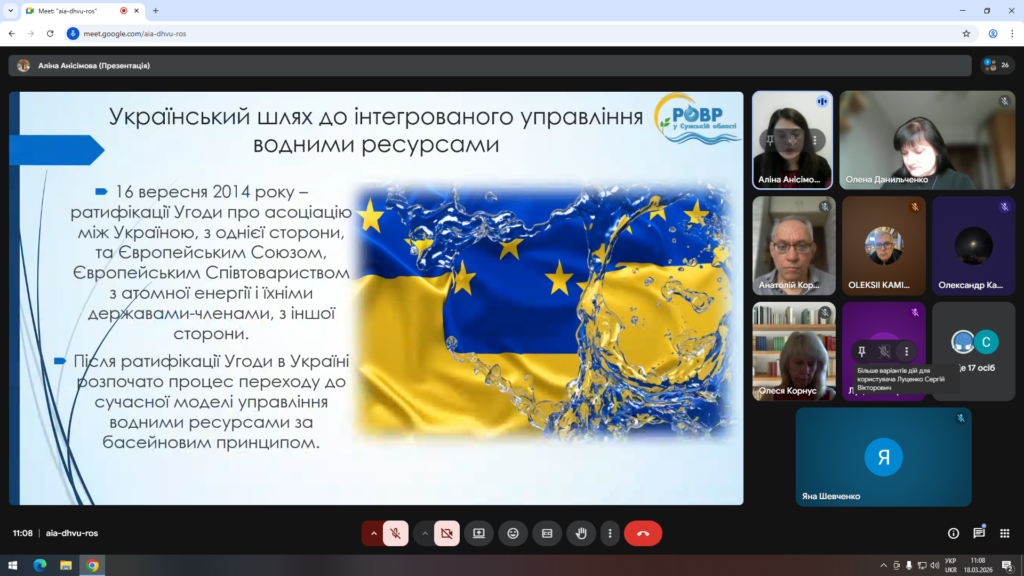 18 березня 2026 року начальник відділу водних відносин та басейнової взаємодії Аліна Анісімова в онлайн-режимі провела лекцію для студентів та освітян кафедри загальної та регіональної географії Сумського державного педагогічного університету імені А.С. Макаренка щодо сучасних інтегрованих підходів до управління водними ресурсами.