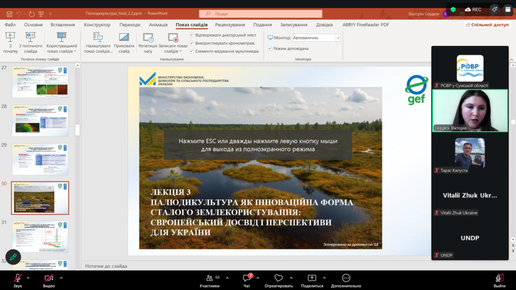 Участь в онлайн воркшопі «Управління торфовищами з урахуванням сталих підходів до тваринництва і впровадження палюдикультури в Україні»